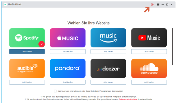 - Laden Sie MovPilot Music herunter und installieren Sie die Software. Klicken Sie anschließend auf das Profilsymbol oben rechts, um das Registrierungsfenster zu öffnen. (Alternativ können Sie MoviePilot Music auch ohne Registrierung testen.)
